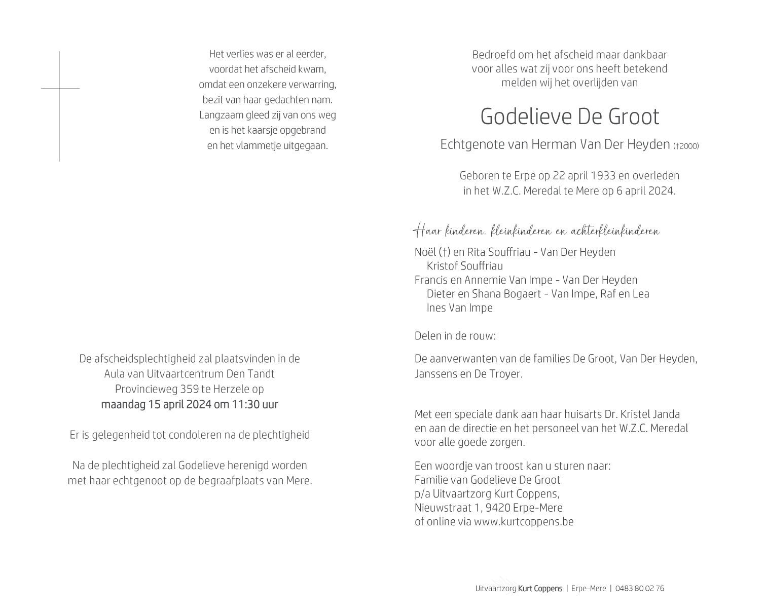Overleden te Mere (9420) op zaterdag 6 april 2024 op 90-jarige leeftijd