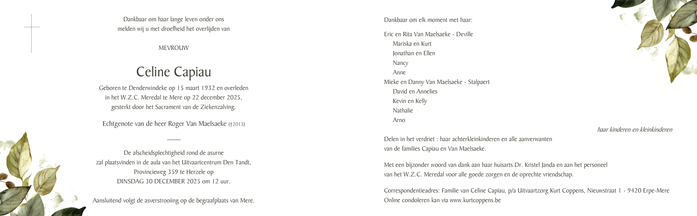 Overleden te Mere (9420) op maandag 22 december 2025 op 93-jarige leeftijd